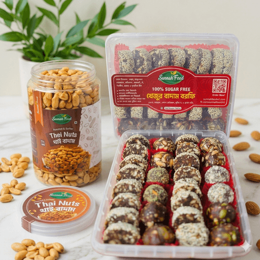 খেজুর ও বাদাম দিয়ে তৈরি সুস্বাদু ও ডায়েট-ফ্রেন্ডলি বরফি ৫০০ গ্রাম 🥜 আর সাথে প্রিমিয়াম কোয়ালিটির থাই বাদাম ৫০০ গ্রাম। 💚 প্রতিদিনের স্বাস্থ্যকর নাস্তার জন্য সেরা পছন্দ – এখন একসাথে স্পেশাল কম্বো দামে!