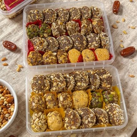 খেজুর, কাজুবাদাম, কাঠবাদাম, থাইবাদাম, চীনাবাদাম, কুমড়োর বিচি, সূর্যমুখীর বিচি এবং ঘি, সাদা তিল